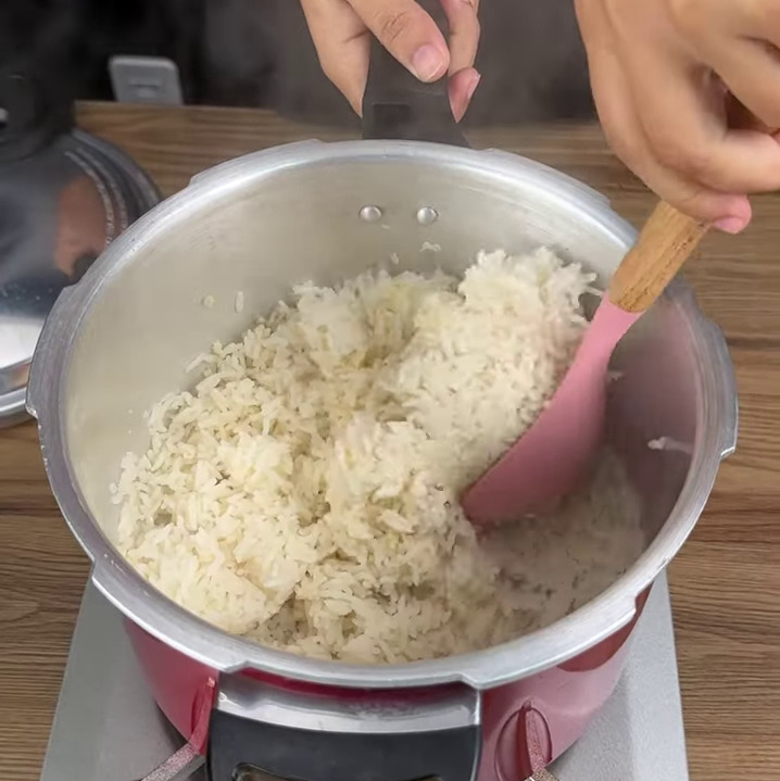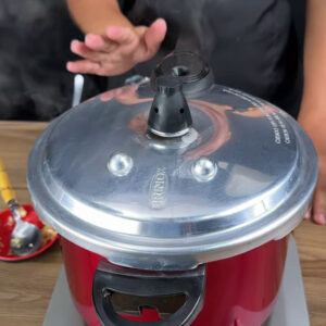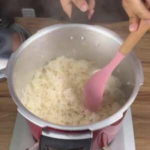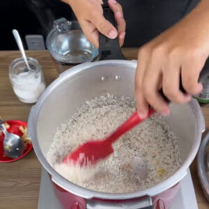 - Adiciono 3 xícaras de água, sal a gosto, tampo e deixo cozinhar por 2 minutos. Depois que pegar a pressão, desligo o fogo e deixo sair por conta própria.