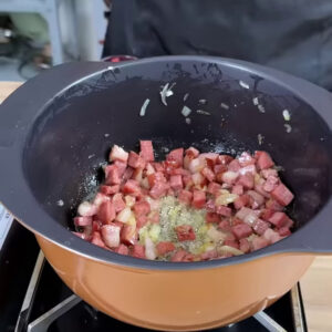 - Para começar, numa panela com óleo vou colocar 1 calabresa picada, bacon, 1 cebola picada e deixar fritar.