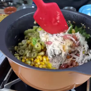 - Depois coloco 1 sachê de molho de tomate, 350g macarrão, água até cobrir, mexo novamente. Adiciono sal a gosto, 1 copo de requeijão, 1 caixa de creme de leite, 250g de queijo muçarela ralado e vou mexer.