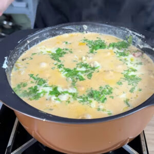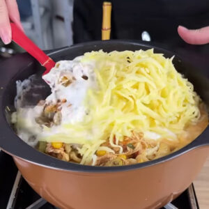 - Acrescento mais queijo, cheiro-verde a gosto, vou deixar cozinhando até o queijo derreter .
