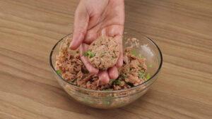 - Para continuar vou colocar os ovos batidos no atum. Vou adicionar também 1 colher de sopa de gengibre ralado, cheiro verde a gosto, a raspa da casca de 1 limão e vou misturar bem esses ingredientes.