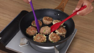 - Em uma frigideira vou adicionar óleo vegetal e vou espalhar. Vou colocar todas as bolinhas para fritar. E quando um lado estiver pronto, vou virar para fritar o outro lado.