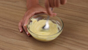 - Agora em uma tigela vou adicionar 2 colheres de sopa de maionese, 1 colher de sopa de molho picante, 1 colher de sopa de mostarda e vou misturar.