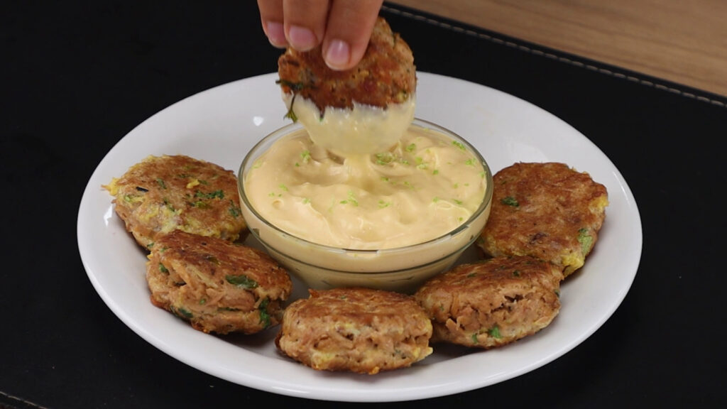 - E para nossa receita ficar ainda melhor, vou mergulhar nossas bolinhas de atum no molho que fizemos. E a nossa receita está pronta, agora é só se deliciar!