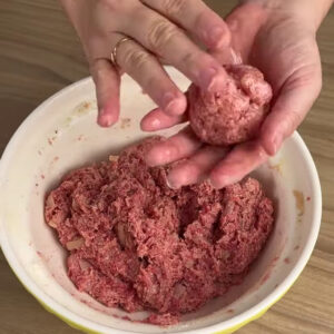 - Para começar, numa tigela com 600g de carne, coloco 2 ovos, 1 copo de leite, 100g de farinha de rosca, 2 cebolas, sal, pimenta do reino, noz moscada, vou mexer bem e em seguida fazer almôndegas.