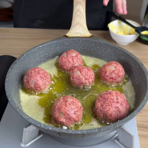 - Numa frigideira com manteiga e azeite, vou colocar as almôndegas e deixar fritar.