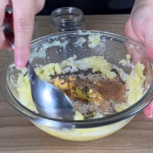 - Em outra tigela com 3 batatas cozidas vou amassá-las. Depois adiciono leite e manteiga, pimenta do reino, 1⁄2 colher de nozes e vou mexer.