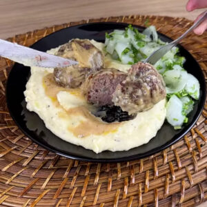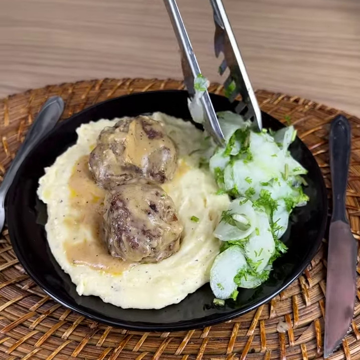 - Depois num prato coloco um pouco da mistura, 2 almôndegas, um pouco do pepino.