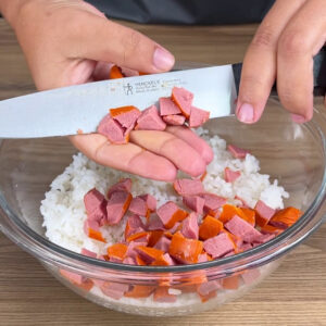- Começando a nossa receita, vou colocar em um recipiente o arroz já cozido. Vou cortar as salsichas e colocar no arroz.