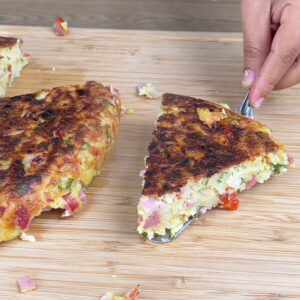 - Vou passar toda a nossa mistura para uma frigideira em fogo médio e deixar assar por 10 minutos. Passado esse tempo vou virar com ajuda de um prato e deixar assar por mais 10 minutos.