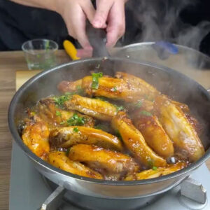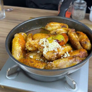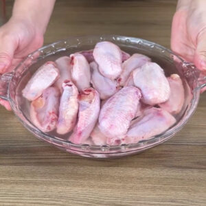 - Para começar, adiciono em uma tigela 800g de asas de frango, água, 1 colher de Bicarbonato e vou reservar por 3 minutos.
