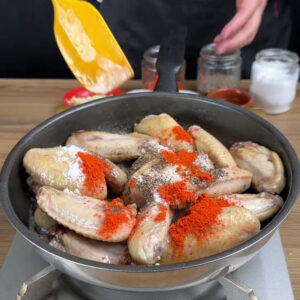 - Depois transfiro o frango para uma frigideira com óleo já quente, vou adicionar 1 colher de sal, 1 colher de pimenta do reino, 1 colher de páprica e vou mexer bem.