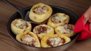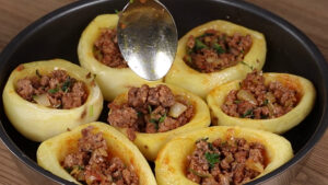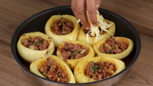 - E para finalizar vou adicionar a carne moída no centro das batatas.