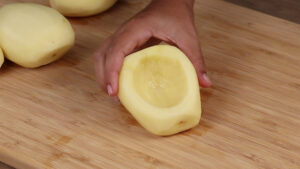 - Para começar vou cortar 4 batatas ao meio, e depois vou retirar o centro com ajuda de uma colher.