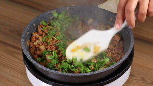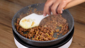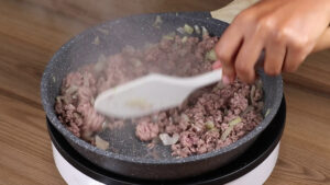 - Após isso vou adicionar 280 gramas de carne moída e vou mexer até fritar.