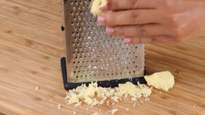 - Para continuar vou ralar 100 gramas de queijo muçarela.