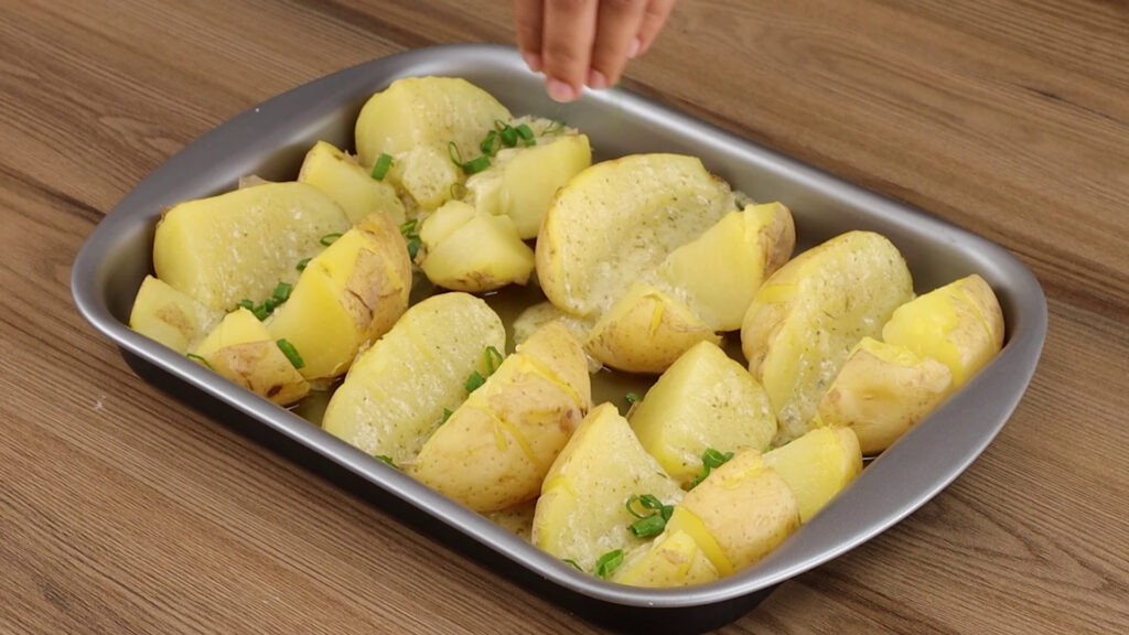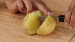 - Agora vou cortar as batatas cozidas ao meio.