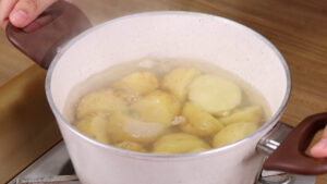 - Em uma panela vou adicionar água quente, 1 pitada de sal, 7 batatas cortadas ao meio e vou deixar cozinhar por 20 minutos. Passado esse tempo vou desligar o fogo e escorrer a água.