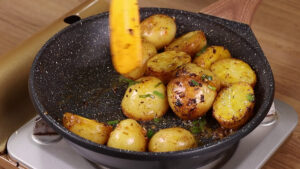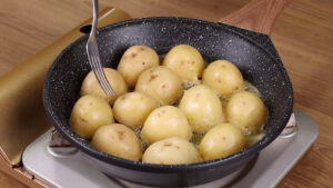 - Agora em uma frigideira vou adicionar margarina e todas as batatas cozidas para fritarem.