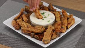 - E para dar um sabor ainda melhor para nossa receita, vou mergulhar nossas berinjelas nesse molho. E a nossa receita está pronta, agora é só se deliciar!
