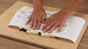 - Vou temperar essas berinjelas com sal a gosto, e depois vou secar com ajuda de um papel toalha.