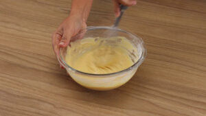 - Em uma tigela vou adicionar 3 ovos, 1/2 colher de chá de sal, 1/2 colher de chá de pimenta do reino, 1/2 colher de chá de corante e vou misturar. Vou adicionar também 100 gramas de farinha de trigo aos poucos.