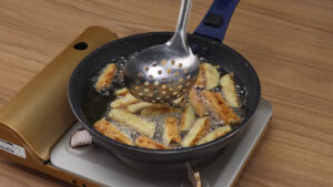 - Para continuar em uma frigideira vou adicionar óleo vegetal. E vou colocar as berinjelas para fritar.