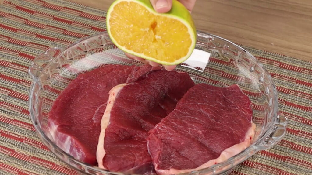 - Para esta receita vamos precisar de 3 bifes, vou começar espremendo o suco de ½ laranja por cima desses bifes.