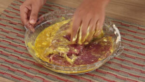- Após isso vou adicionar 1 colher de chá de sal, 1 colher de chá de pimenta do reino, 2 dentes de alho picados, 1 ovo, 1 colher de sopa de maionese, 1 colher de sopa de mostarda e vou mexer esses ingredientes até que se agreguem bem a carne.