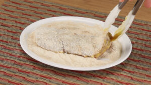 - Agora vou passar essa carne temperada na farinha de rosca para que fique bem empanada.