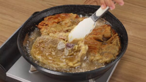 - Para continuar em uma frigideira vou adicionar óleo. E quando esse óleo estiver bem quente, vou adicionar toda a nossa carne. E vou virar para que frite os dois lados.