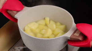 • Depois de cozidas, vou escorrer, adicionar em uma peneira e vou amassar essas batatas com ajuda de uma colher.