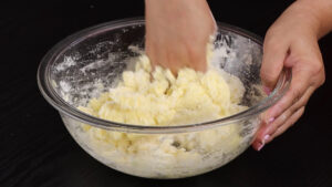 • Agora vou passar tudo para uma tigela, adicionar 1 ovo, 1 colher de chá de sal, 150 gramas de amido de milho, 75 gramas de queijo muçarela, e vou misturar bem.