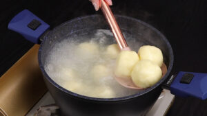 • Em seguida em uma panela vou adicionar água, 1 colher de sopa de óleo, as bolinhas e vou deixar cozinhar em fogo médio.