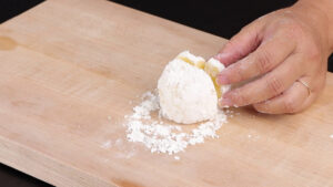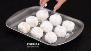 • Agora, vou empanar essas bolinhas no amido de milho, adicionar em uma forma e deixar esfriar por 15 minutos.