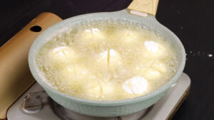 • Por fim em uma panela vou adicionar óleo, colocar todas as bolinhas e deixar fritar.