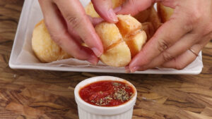 • Para ficar ainda mais gostoso, vou servir com ketchup. E a nossa receita está pronta agora é só se deliciar!
