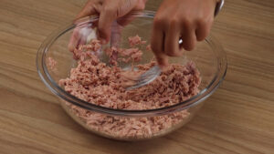 - Para começar em uma tigela vou adicionar 3 latas de atum, e vou amassar com ajuda de um garfo.