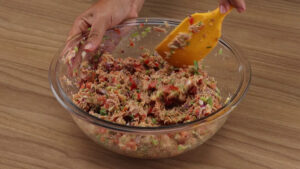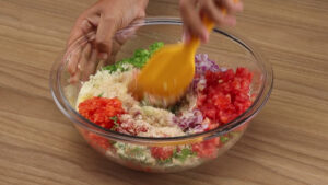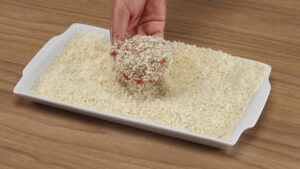 - Agora vou pegar uma parte dessa mistura e vou modelar em formato de bolinhas. Depois vou passar nos ovos batidos e na farinha de rosca.