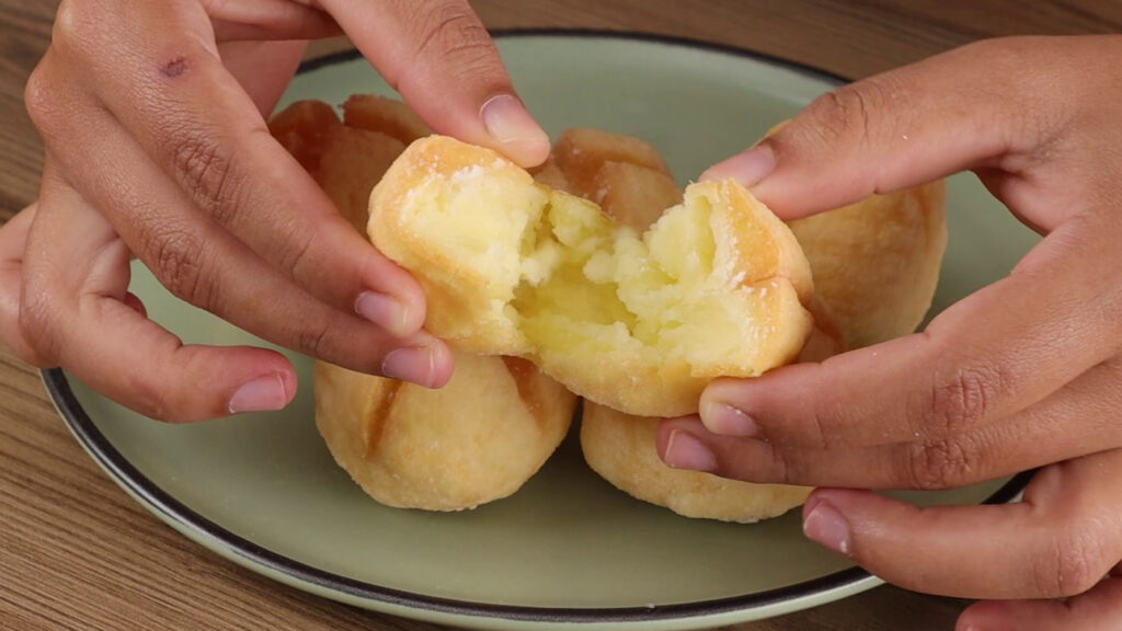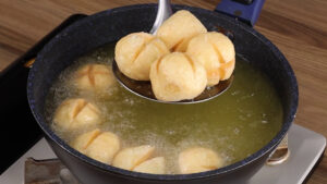 - Passado esse tempo vou colocar essa massa em uma frigideira com óleo e vou deixar fritar.
