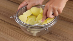 - Em seguida vou escorrer toda a água dessas batatas e amassá-las com ajuda de uma colher.