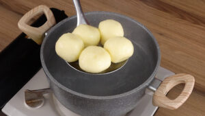 - Para continuar, em uma panela vou adicionar água, 1 colher de sopa de óleo e vou mexer. Quando essa água estiver fervendo vou adicionar as bolinhas e deixar cozinhar por 15 minutos.