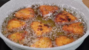 • Irei adicionar óleo em uma frigideira e quando esse óleo estiver quente vou adicionar aqui as batatas empanadas para fritarem.