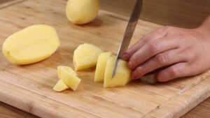 • Para a nossa receita nós vamos precisar de 500 g de batatas, cortarei essas batatas ao meio e depois ao meio novamente e por fim em cubos.