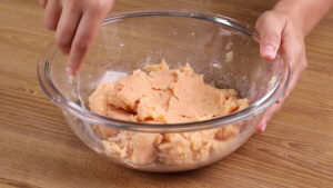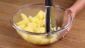 • Em uma panela em fogo alto vou adicionar todas essas batatas cortadas, água até cobrir e vou deixar cozinhar por 20 minutos. Passado esse tempo vou desligar e escorrer toda a água das batatas. Passarei todas essas batatas cozidas para dentro de uma tigela e com um amassador de batatas vou amassar bem até virar um purê.