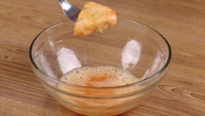 • Agora em uma tigela vou adicionar 1 ovo, 1 colher de chá de sal, 1 pitada de corante e vou misturar bem. Passarei todos os nossos triângulos de batata aqui dentro da mistura de ovos.
