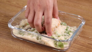 • Depois passarei esses triângulos em uma mistura de pão ralado com cheiro verde, irei fazer esse mesmo processo com todos eles para que fiquem bem empanados.