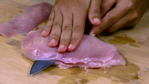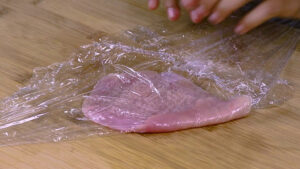 - Em seguida vou enrolar esse frango em um plástico filme e vou bater com ajuda de um martelo para ficar macio. E vou fazer isso com todos os filés.