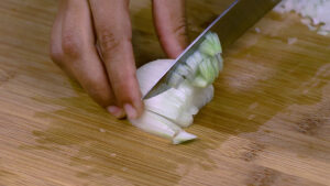 - Para continuar vou cortar 1 cebola ao meio e depois em cubos. Vou cortar também 300 gramas de cogumelo.