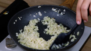 - Em uma frigideira vou adicionar 1 fio de azeite de oliva, as cebolas, 1 colher de chá de sal, 1/2 colher de chá de pimenta do reino e vou refogar.